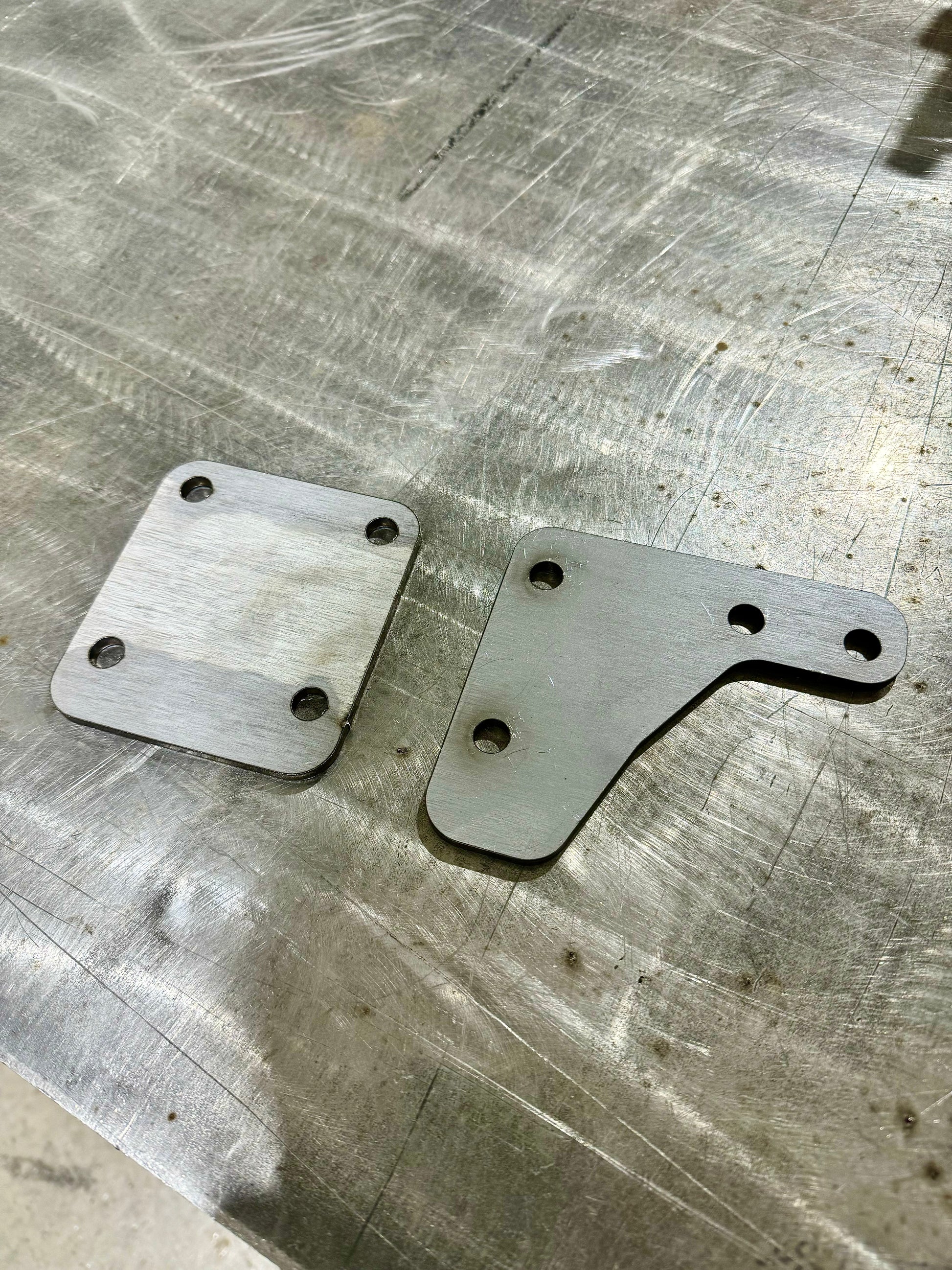 Universal traditional style motor mount plates to build your own motor mounts off of to your specific chassis. These are laser cut out of 3/16" HRPO. Enough flat space between the 4 M10 mounting holes per side to attach a 1.75" tube. I usually run these plates on the block with a 1.75" DOM tube standoff to a poly bushing welded to the end of the tube, then tabs mounted off the chassis to attach to. I use universal poly bushings from WFO with a 1/2" bolt, the advantage to these bushings is they also sell aluminum bushing inserts so you can use the same mount but have a solid mounted drivetrain or just use the aluminum bushing for mockup and welding to prevent melting your poly bushing.