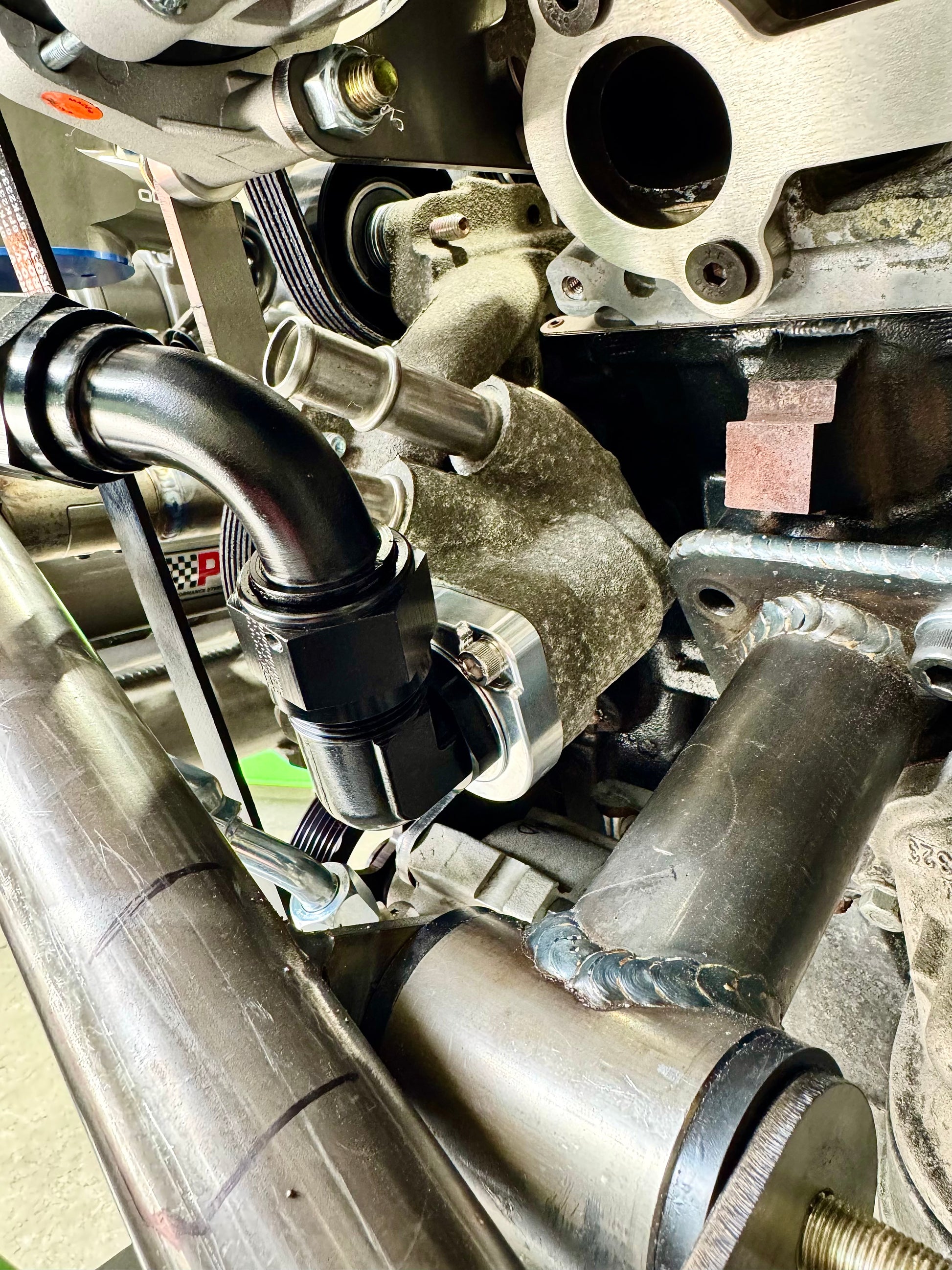 This plate allows you to thread in a -16 ORB (straight cut o-ring) to -16 Male AN fitting of choice in either straight or an angle of choice to point your coolant hose in the best direction for packaging and clearance. Below are some options that will work (there are many options/brands/prices, these are just examples),